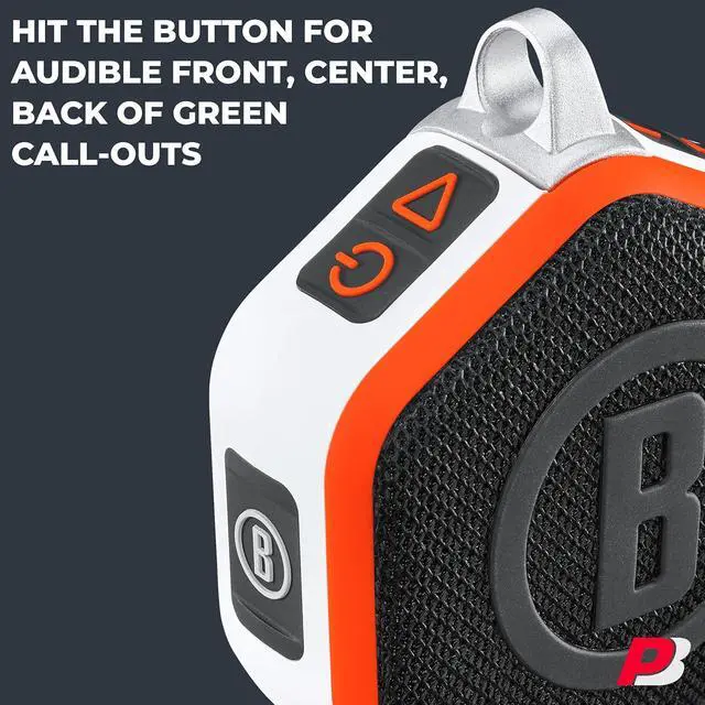 [INSTANT AUDIBLE DISTANCE READINGS] - This Mini version of the Bushnell Wingman GPS golf speaker offers accurate audible distance readings for the front, center, and back of the green. By simply pressing the "B" button, quickly access over 38,000 courses, plus audible 1st tee introductions and custom sound bites.