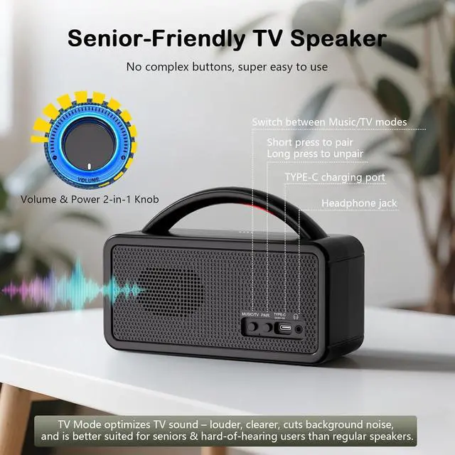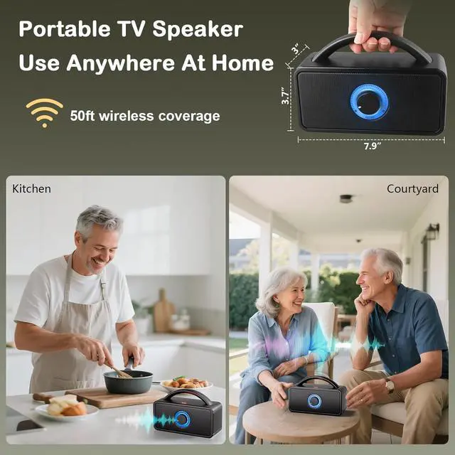 Use Anywhere At Home: Our portable TV speaker lightweight and easy to carry, with a stable 50ft wireless range. Take it to the kitchen, bedroom, or patiolisten to TV while cooking or relaxing. Switch between TV/Music Modes anytime: Voice Mode is optimized for seniors, enhancing dialogue and reducing noise (better than regular speakers for hearing impairments).