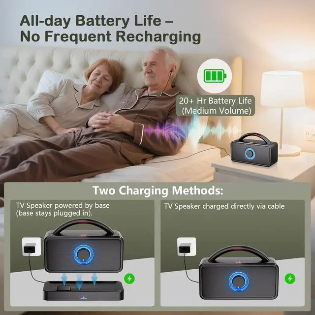 Senior-Friendly & Long Battery: Our tv hearing devices for seniors feature one large 2-in-1 knob (power + volume) and a few other simple buttonsno complex controls, just simple, practical operation. Battery life lasts over 20hrs (at medium volume), enough for all-day use, no frequent recharging. Two easy charging ways: place on the base (auto-charges) or use the direct power cord.