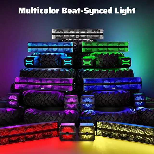 Dynamic RGB LightingThe subwoofer has additional RGB LED lights on the center and sides, creating a cool and stunning effect as the lights reflect onto the vibrating utv speakers. The two full-range speakers come with blue LED lights that change in brightness with the volume, adding a dynamic and stylish visual element. Light and music merge for a thrilling rock audiovisual experience on your journey