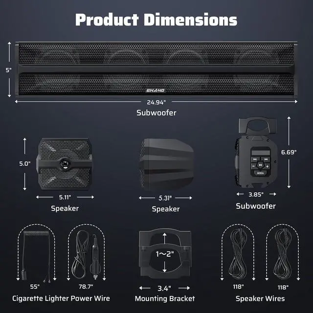 Powerful 2.1 Stereo SoundEhaho 2.1 channel sound system comes with 2x 4" full-range speakers and 26-inch rectangular subwoofers which gives you a peak power of 700W. The Ehanced subwoofer with 2x 4" speaker unit delivers a deeper, and two full-range diaphragms, richer bass sound. Even in intense off-road adventures, experience powerful and immersive surround sound for a realistic music experience