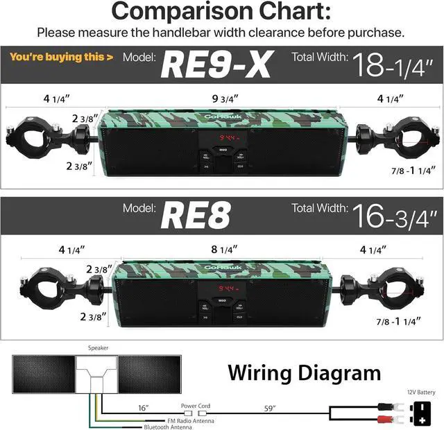 You are purchasing the Model RE9-X with 18-1/4 overall width. Please check your handlebar center clearance before purchase.New Mounting Clamp Supports 7/8 to 1 1/4 Handlebar. Camouflage colors and patterns on the screen may vary from actual product.