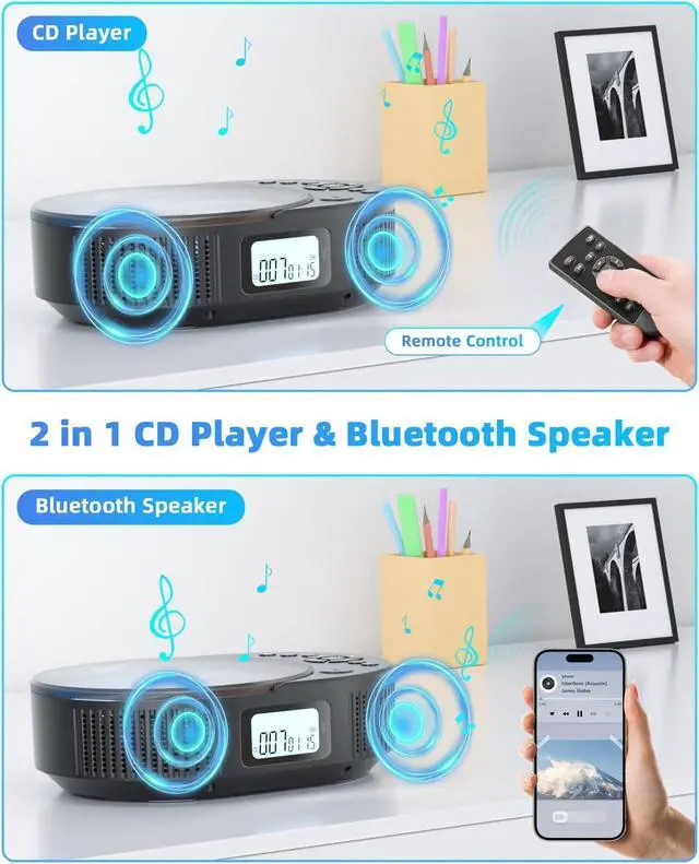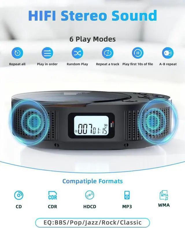 Simple and Compact CD Player The operation interface of the CD player is simple and intuitive, so even first-time users can get started quickly. At the same time, it also supports 6 playback modes: repeat all, play in order, repeat a track, random play, Play first 10s of file, and A-B repeat. There are buttons on the body to facilitate you to switch modes and volumes. The included remote control allows you to control the CD player without getting up while sitting on the sofa.