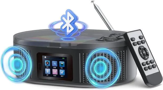 Bluetooth CD players for HomeThis CD player portable with is Bluetooth transmitter and receiver, is different from other players. It also can connect to phone, laptop, tablet to work as a bluetooth speaker. Upgraded dual speakers provide the clearer and louder sound and the volume can be adjusted as needed via buttons or remote.