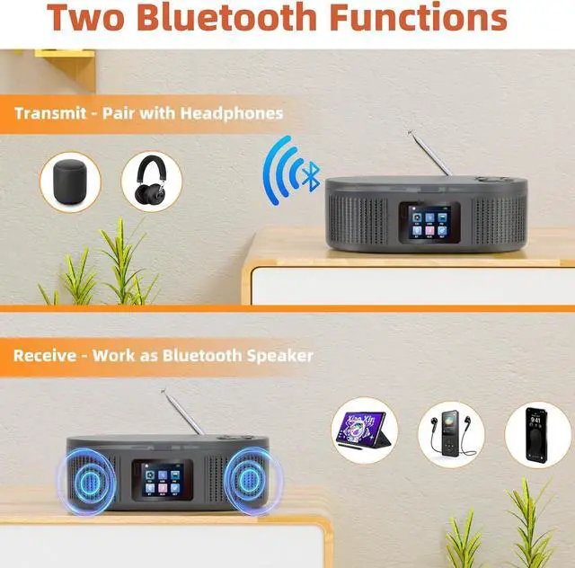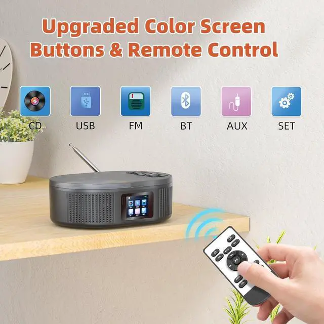 • Bluetooth CD players for HomeThis CD player portable with is Bluetooth transmitter and receiver, is different from other players. It also can connect to phone, laptop, tablet to work as a bluetooth speaker. Upgraded dual speakers provide the clearer and louder sound and the volume can be adjusted as needed via buttons or remote.