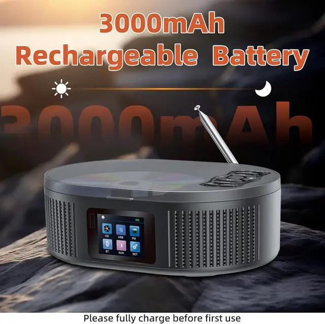 Desktop CD Player RechargeableDesobry portable CD player has the rechargeable function. It can use without connect to the power, so you need to bring it out easily. The type-C to USB charging cable is provided. The romote control comes with small cd player can let you feel free to switch playback modes; radio programs; volume adjustment; and other operations conveniently eventhough you are not arround it.