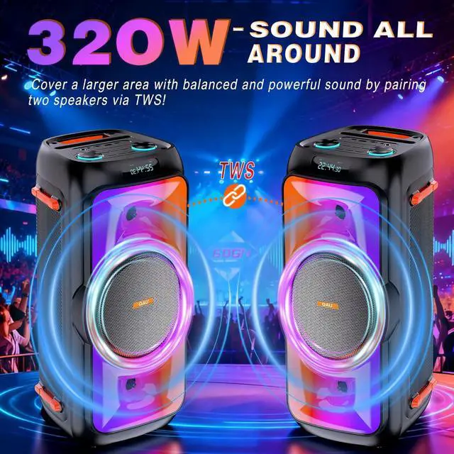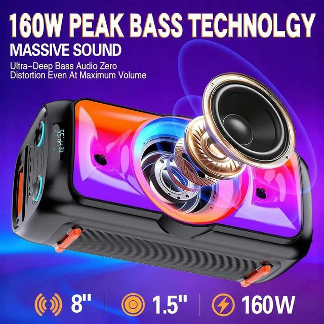 [Loud 160W Sound Built for Parties]Turn up the volume and keep the energy high. This portable Bluetooth speaker delivers powerful 160W sound with deep bass and clear highsperfect for party speaker use at home, in the backyard, or outdoors without distortion.