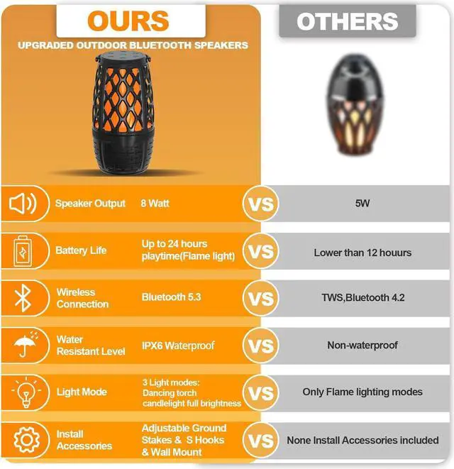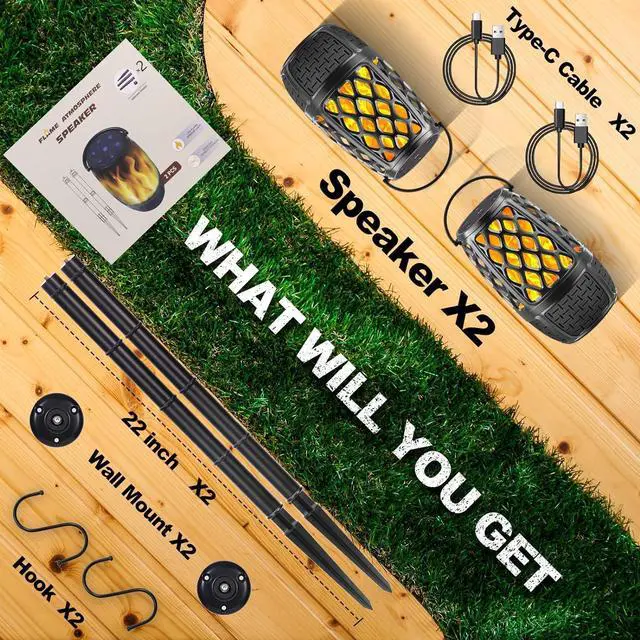 Multi-function LED Flame Bluetooth Speaker: Portable Bluetooth speakers come with height-adjustable ground stakes, S hanging hook, wall mount, you can take the flame light speaker as a desktop speaker, stick it in-ground as outdoor torches or the option as an ambiance lamp to hang indoors in the house, hang out a tree branch. Great accessories for hot tub, pool, golf, BBQ, kitchen, fire pit, garden, yard, RV and beach.
