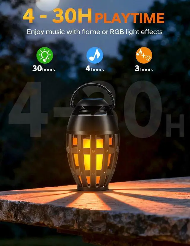 Multi Functional LED Atmosphere Speaker: These outdoor speakers combine the functions of an LED flame effect, a night light, a decorative lantern, and an ambience lamp. They offer 7 lighting modes: flame effect, 5 RGB types & constant white light, creating a romantic, dynamic visual experience and adding a unique ambiance to your space, whether indoors or outside