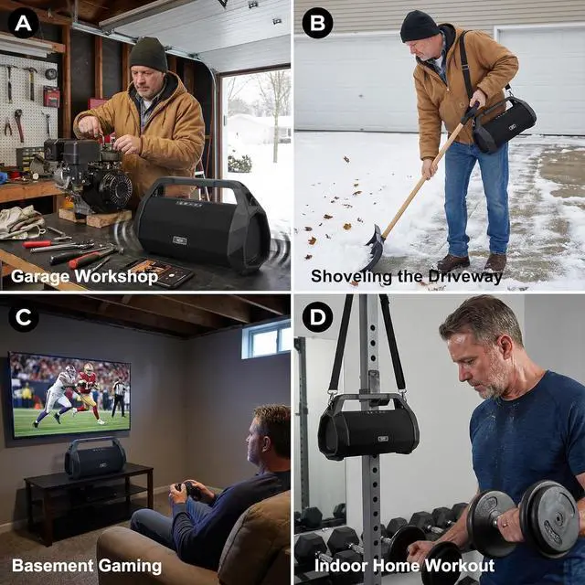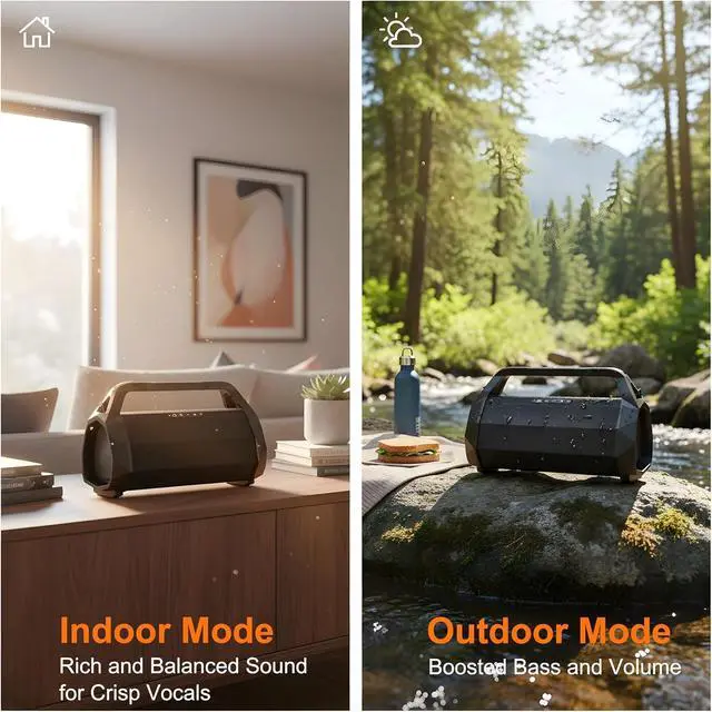 Indoor/Outdoor Mode with Dynamic EQ: Hold pause button (3 sec) to switch modes for optimized sound in any environment. Indoor mode: Ideal for home theater, gaming, workshop, garage, fitness studio, kitchen, and office; Outdoor mode: Boosts volume & bass for open-air gatherings. The affordable weathproof outdoor boombox bluetooth speaker is a perfect gift for birthday, Valentine's day, Father's day, Thanksgiving, Christmas, New Year gift for family or friends