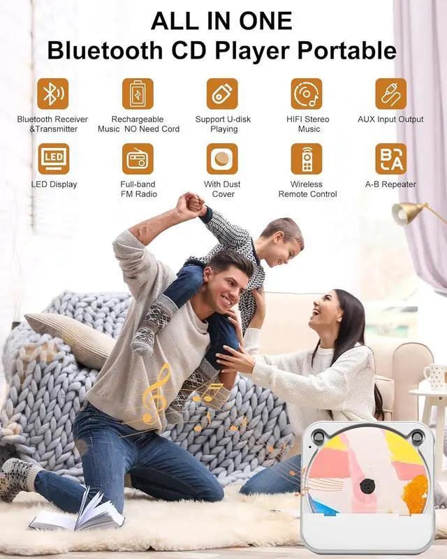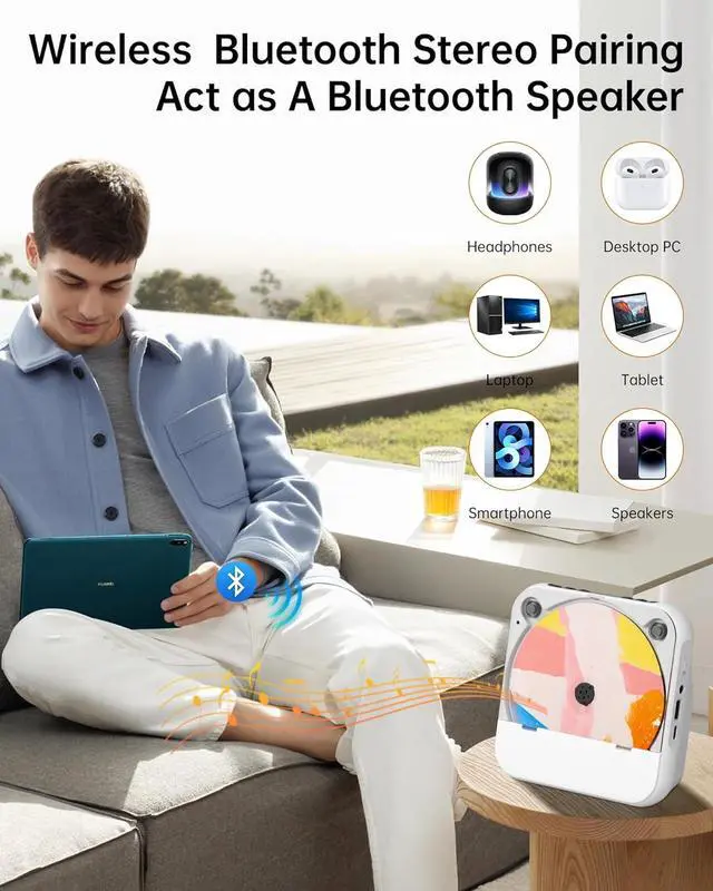 Built-in Bluetooth and SpeakerPortable CD Player features a built-in Bluetooth transmitter and Bluetooth receiver. mini cd player can connect to Bluetooth speakers and headphones, as well as receive Bluetooth signals from cell phones and tablets. Additionally, it can function as a audio speaker to play wireless music. The Bluetooth connection is reliable, with a long transmission range and low power consumption.