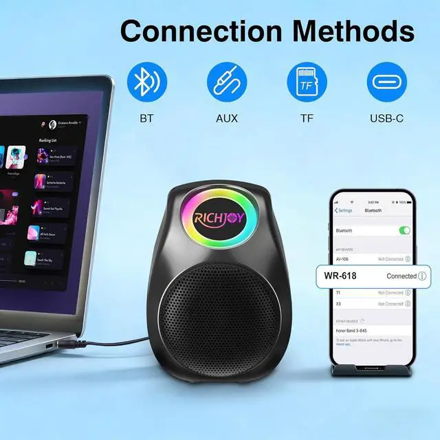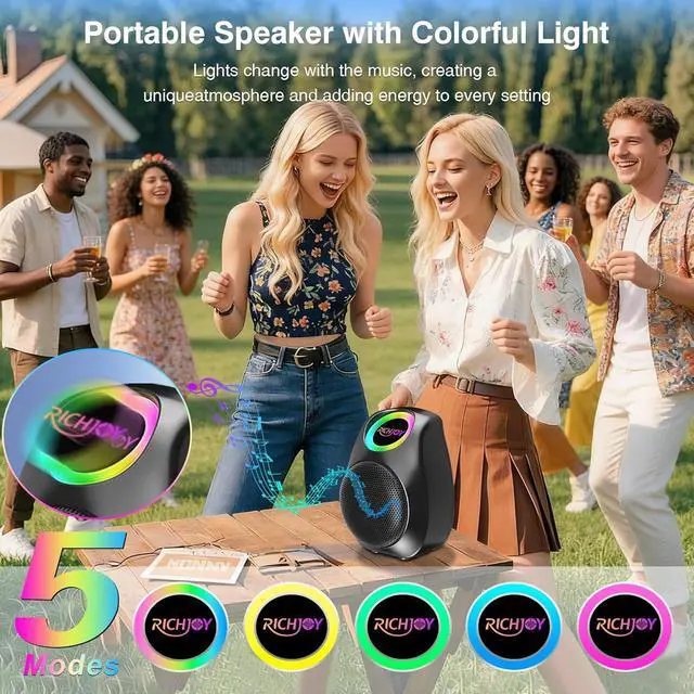 Dynamic RGB Light Show Syncs to Music: The bluetooth speakers wireless with vibrant RGB cycling lights pulse,flash and change colors in sync with music's beat.Choose from various lighting modes to create the perfect visual atmosphere for parties,camping or personal relaxation