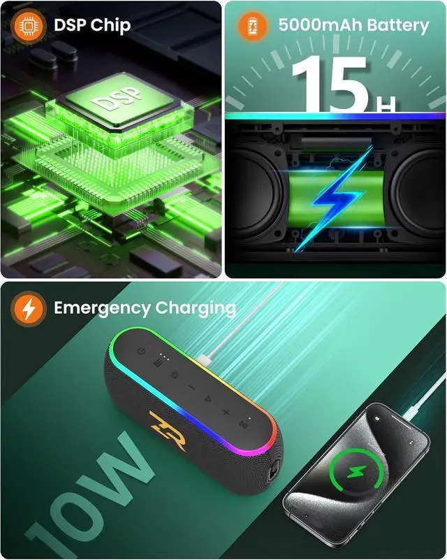 DSP Technology & 3 Audio SoundsBluetooth speaker features dual tweeters, a passive radiator, and DSP technology for premium sound. With 3 audio modes3D Stereo, Vocal, and Super Bassswitch effortlessly via the EQ button. Its compact design delivers deep bass and crystal-clear audio, perfect for any listening preference.