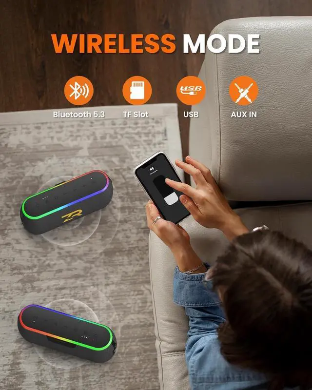 Multi-function connectionBluetooth speaker equipped with Bluetooth 5.3 for extended range and stable wireless connections. TF/SD card (supports WAV / FLAC / APE / MP3 format), Type-C interface USB flash drive, and AUX input, The built-in microphone ensures clear calls, compatible with iPhone, iPad, Android, and more.