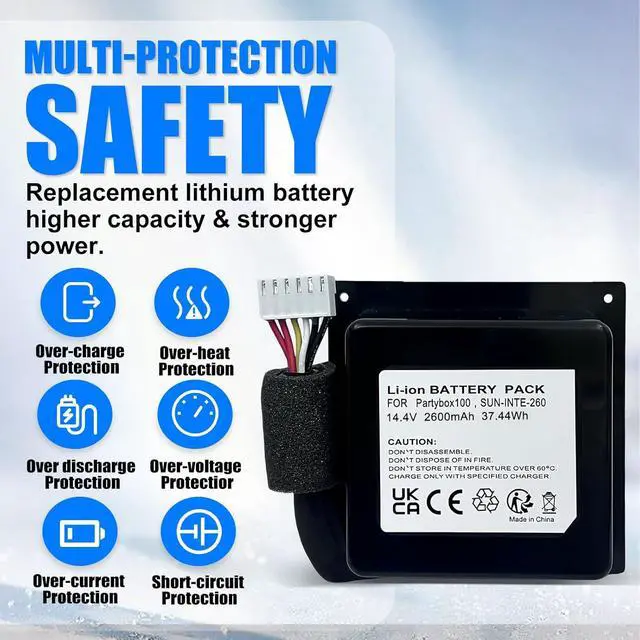 Easy to Install & Reliable Quality: Directly replace the battery on PartyBox 100 bluetooth speaker, no need extra tools. The product's reliability is confirmed through tests such as FCC, UL, CE, RoHS, and more. It comes equipped with protection modules including temperature, overcurrent, and overvoltage protection, safeguarding both the battery and your bluetooth speaker tools.
