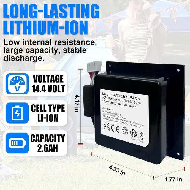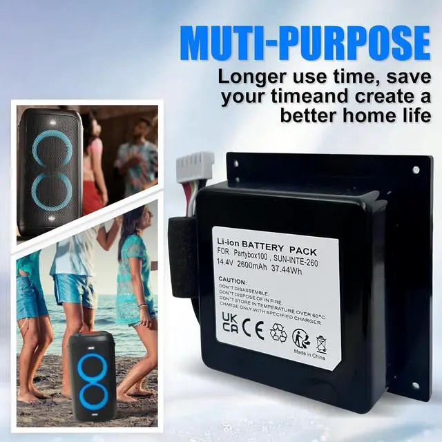 Compatible Device: Replacement battery compatible with PartyBox 100 wireless bluetooth speaker. Replacement for SUN-INTE-260 Battery.