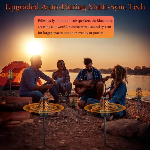 Upgraded Outdoor Bluetooth Speakers Auto-Pairing & Multi-Sync Technology (Up to 100 Speakers): Enjoy seamless, synchronized sound with Auto-Pairing Multi-Sync technology, allowing you to connect up to 100 speakers simultaneously. Create a concert-like experience across your backyard or patio with the press of a button.