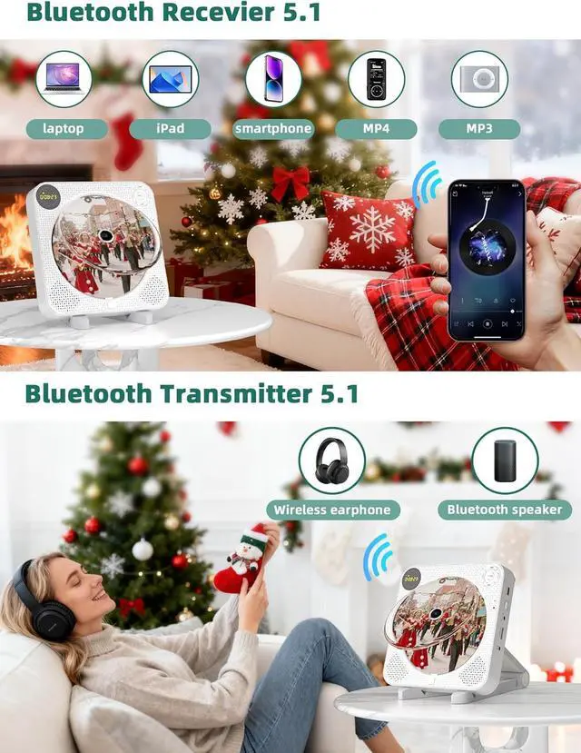 Bluetooth CD Players for Home Our home CD player can not only play collector's edition CDs, but is also equipped with Bluetooth 5.1 version, which has Bluetooth receiving and transmitting functions. It can connect to your wireless headphones or Bluetooth speakers to play music, and can also receive signals from Bluetooth devices such as mobile phones, tablets, and laptops to easily play music.