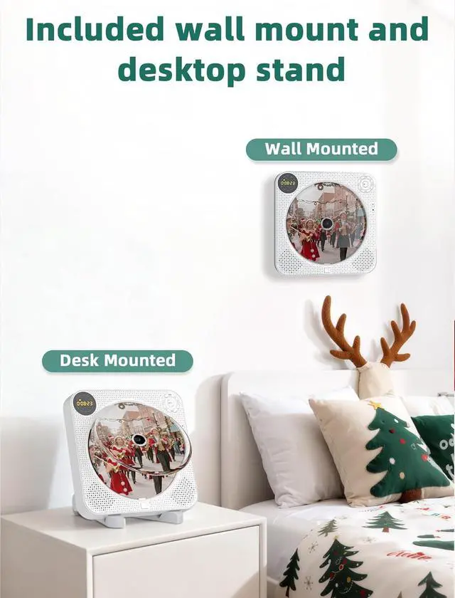 Wall & Desk CD PlayerThe small wall mounted CD player comes with a desk stand and a wall-mounted plate. You can install it in the living room, bedroom, kitchen, bathroom and other place. The beautiful music will take away all the tiredness of your family. In addition to wall-mounted, you can also use the desktop stand to put it on the table to play audio books.