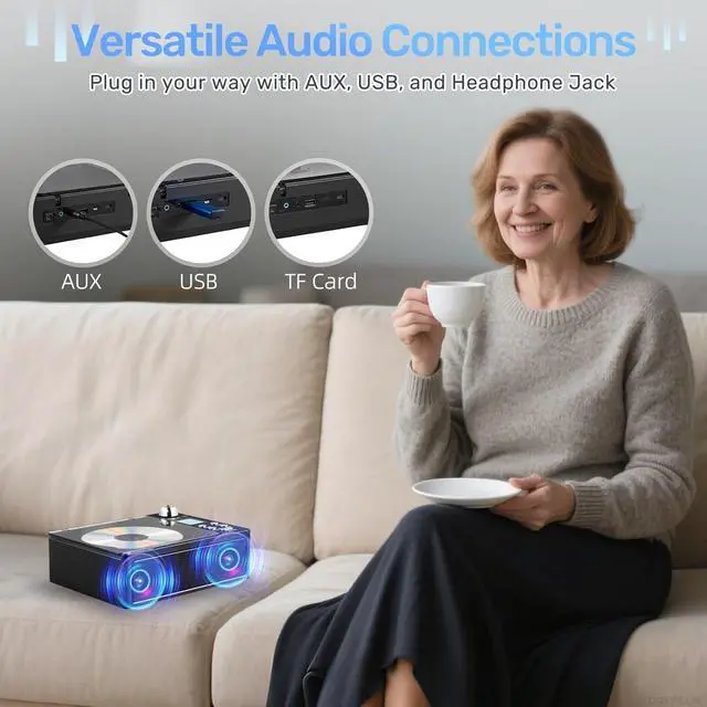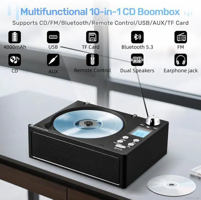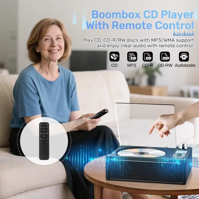 Multifunctional CD Player: Supports CD, AUX, FM radio, Bluetooth, USB, TF card, and remote playbackgiving you multiple ways to enjoy your music. Compatible with CD, CD-R, CD-RW, MP3, and WMA formats. With a headphone jack and compact remote, it meets diverse audio needs for home, work, or travel. Enjoy your favorite albums, audiobooks, and custom mixes with features like repeat play and program mode for a truly personalized listening experience
