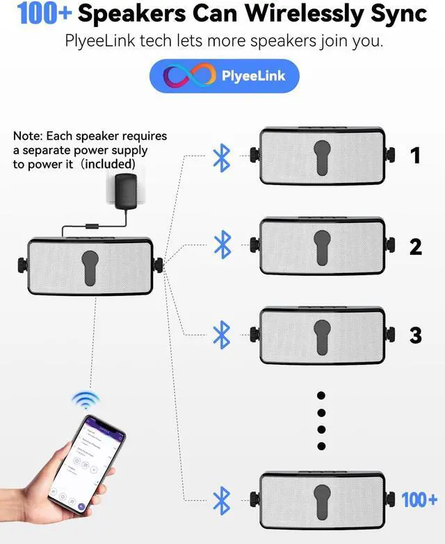 : Each speaker requires its own power adapter (2 included). Bluetooth only; wired AUX input is not supported. Due to Bluetooth latency, not recommended for TVs or projectors for real-time video playback.