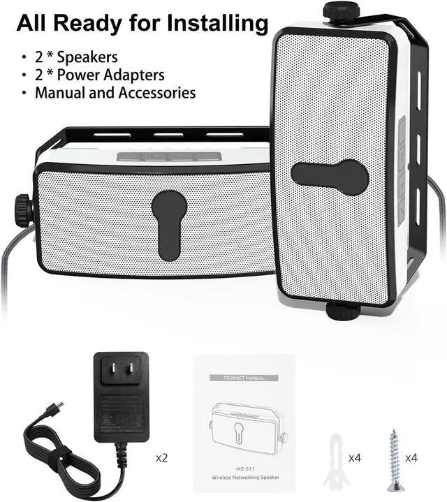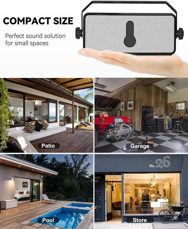 : At 7.69" x 2.99 x 2.13", these linkable bluetooth speakers fit perfectly under porches, patios, gazebos, garages, or small shops. Includes all mounting accessories for easy installation.