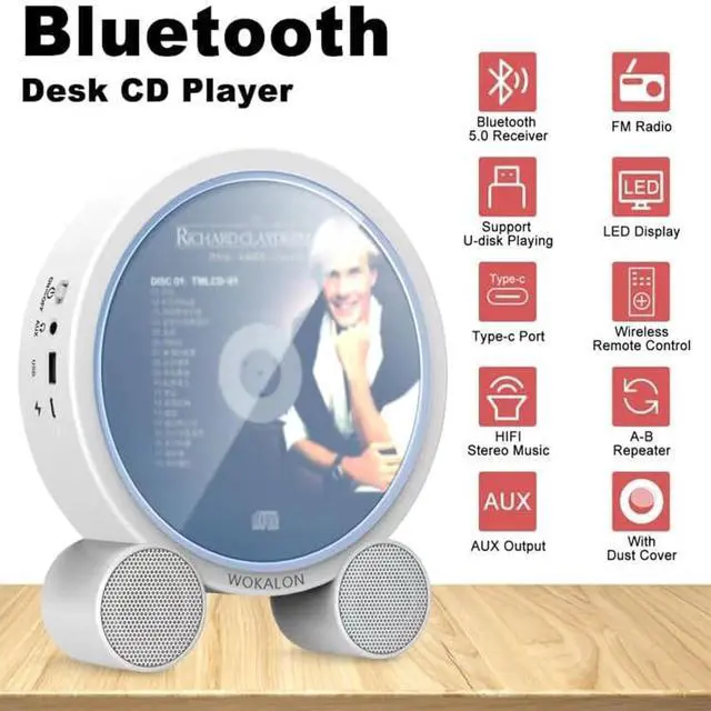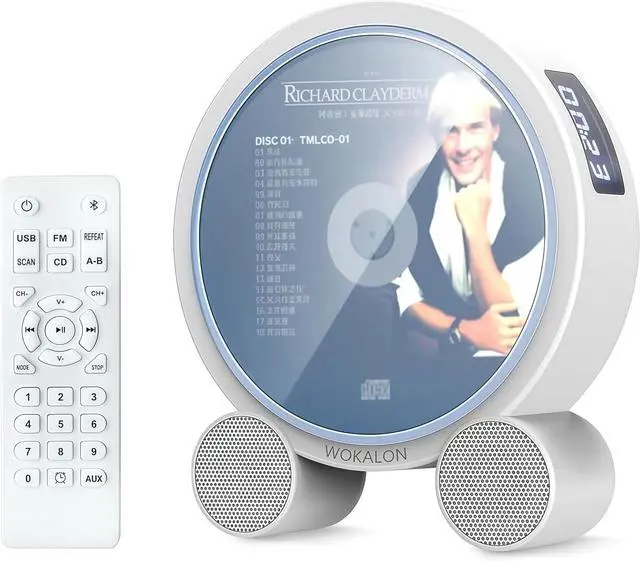 Multi-Function CD playerWOKALON CD player with desktop vertical design,has up to 13 kinds of functions, Including CD, FM, Bluetooth, AUX, TF, USB, timer, repeat, HIFI, buttons. the bluetooth cd player function is compatible with five CD formats, including CD, CD-RW, CD-R, MP3, and WMA.You also can listen the music via USB or AUX mode. cd palyer can be used in a variety of settings, such as at parties,Yoga Exercise, learning education,Office,and so on.