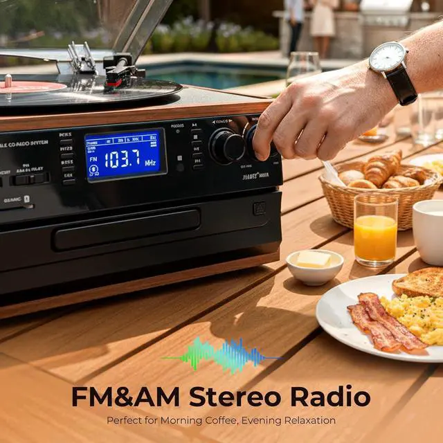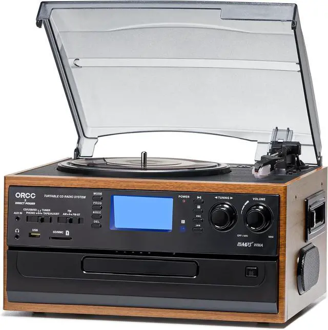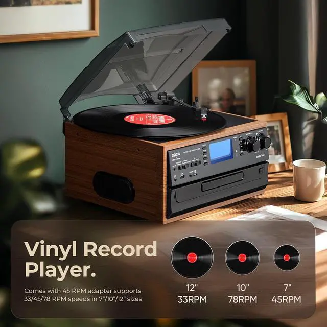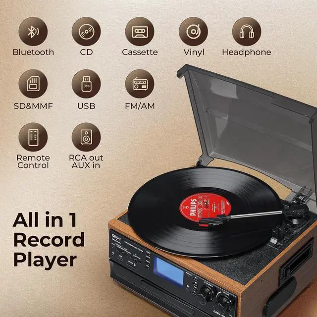 10-in-1 Vinyl Turntable with Speakers : Not only Vinyl, this ORCC turntable also supports CD, Cassette, USB, SD/MMC card play, line in music from external devices by built-in Bluetooth receiver or Aux in jack. Besides, you can use it as FM/AM radio, with RCA line out allows you to listen to music via your own speaker, bring you variable music playing ways.
