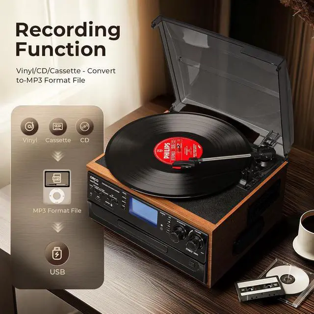 Multifunctional Bluetooth Turntable Record Player : Featued with recording function, supports convert Vinyl, CD, Cassette, Aux-in to USB flash drive/SD card directly in MP3 format. No PC or laptop required, easily digitize your favorite vinyl records to MP3.