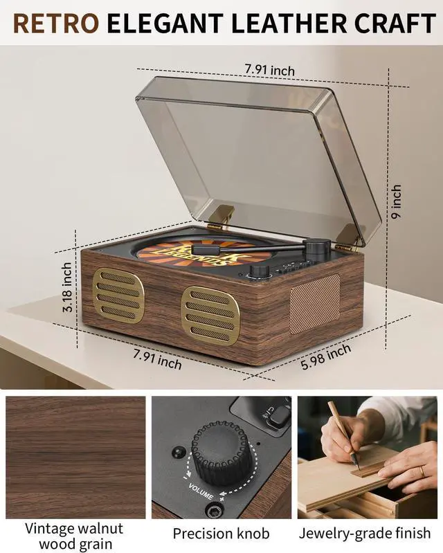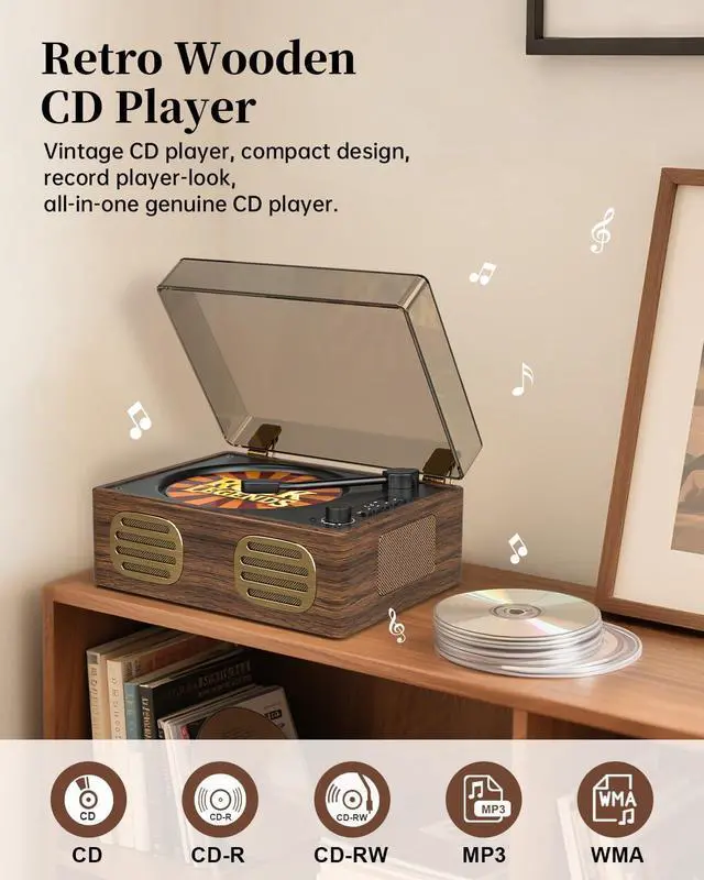 Versatile Retro-Media Hub: This multi-format music player effortlessly bridges generations, supporting CD playback, USB input for digital libraries, and AUX-in for other devices, all controlled through a user-friendly interface within its vintage-inspired walnut chassis.