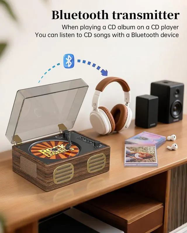 Seamless Modern Connectivity Meets Retro Charm: Enjoy Bluetooth output for wireless streaming to your headphones or speakers, alongside USB playback and AUX-in support, seamlessly integrated into the vintage CD player's classic walnut wood grain cabinet.