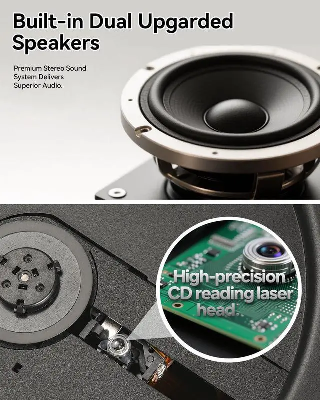 Powerful Upgraded Sound with Timeless Design: Experience rich, room-filling audio from the upgraded speakers, housed within a sophisticated walnut wood grain finish. This rechargeable CD player delivers high-fidelity sound wrapped in enduring vintage aesthetics.