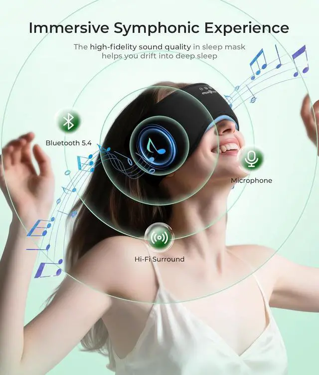 Hi-Fi Sound & Bluetooth 5.4 Technology - MUSICOZY Sleep Headphones equipped with the latest Bluetooth 5.4 chip and advanced acoustic drivers, enjoy seamless connectivity and stable crystal-clear, immersive Hi-Fi sound for music, podcasts, or bedtime.