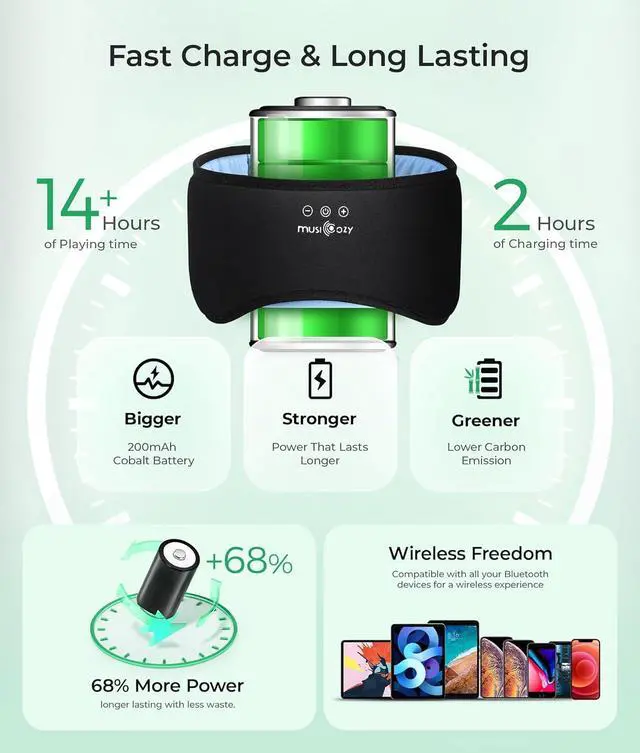 14+Hour Playtime & 2-Hour Charge - Say goodbye to battery anxiety with MUSICOZY Sleep Headphones Headband! The powerful battery offers up to 14+ hours of enjoying playtime after 2 hours charging, lasting through multiple trips without frequent charging.