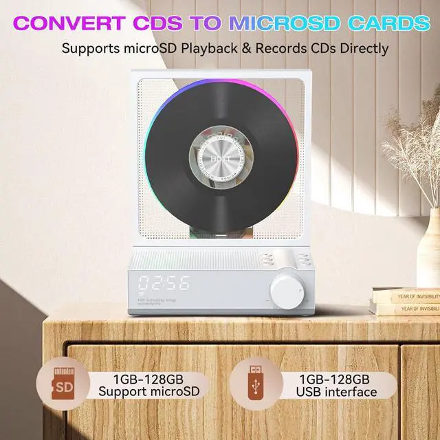 Multifunction CD PlayerCD player with Temperature control (NTC) protection function. you can transcribe the music of your favorite CDs to the Micro SD,Music CD player supports CD/MP3/CD-R/CD-RW disc formats and CD-DA/MP3/WMA music formatsNote: To avoid skipping and prolong its life,the disc stops revolving intermittently when playing