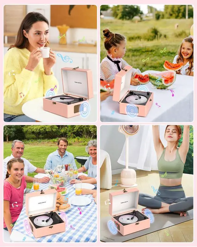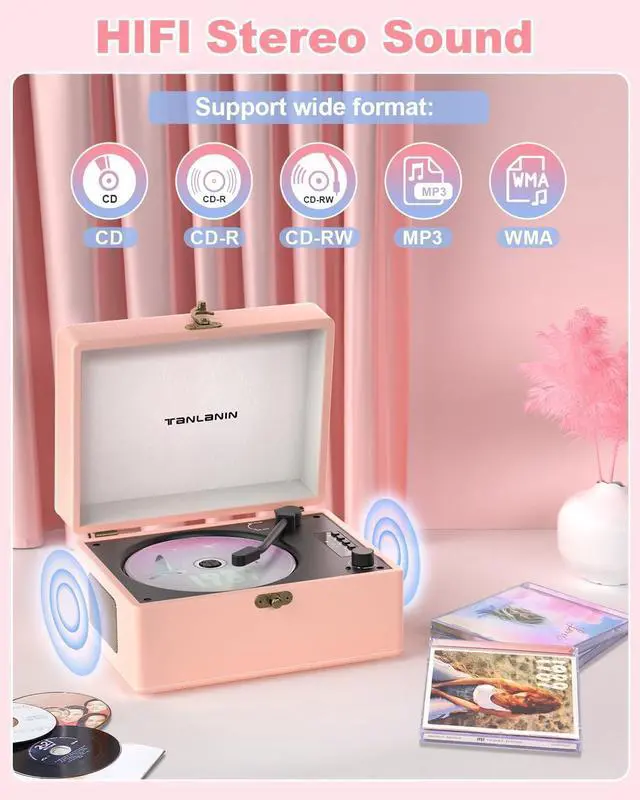 All-In-One CD Player- It combines all function in one desktop CD playe 1. Portable Rechargeable CD player 2.Bluetooth 5.0 Speaker 3.Bluetooth 5.0 Wireless Transmitter 4.USB Fash Drive Music Player 5. 3.5mm Audio Payer 6. Vintage Home Artwork. It supports versatile formats including CD, CD-R, CD-RW, MP3, and WMA.