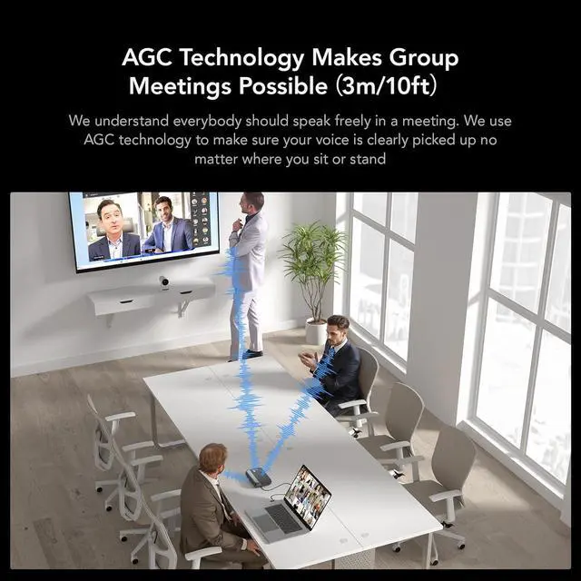 Full Duplex & Automatic Gain Control: Full duplex audio processing technology allows multiple people to talk at the same time without missing a word. With the help of AGC technology, the volume of the voices within 3m/10ft can be adjusted automatically so the voices of all conference participants can even be understood equally well, even if they sit at different distances and speak at different volumes.