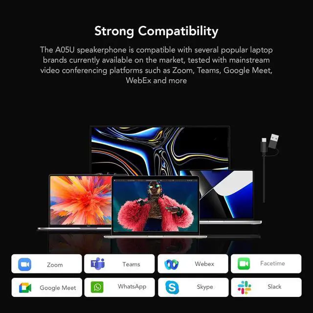 Universal Compatibility: The Nuroum A05U works with most conferencing programs, and compatible with major conferencing platforms like Zoom, Teams, Google Meet, and Webex. It is also compatible with a variety of computer models, and the type-C and USB-A connections can be used with all operating systems including Windows, macOS and Linux. This flexibility allows you to easily convert any space into a functional office at any time.