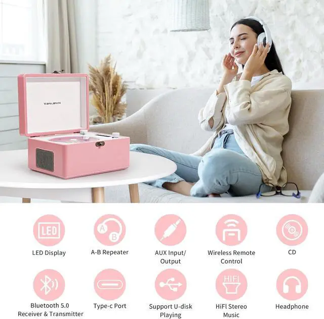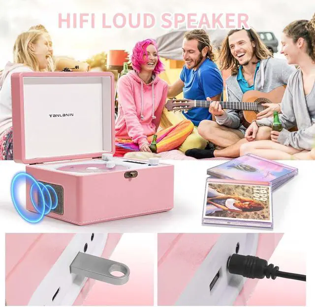 All-In-One CD Player- It combines all function in one desktop CD playe 1. Portable Rechargeable CD player 2.Bluetooth 5.0 Speaker 3.Bluetooth 5.0 Wireless Transmitter 4.USB Fash Drive Music Player 5. 3.5mm Audio Payer 6. Vintage Home Artwork. It supports versatile formats including CD, CD-R, CD-RW, MP3, and WMA.
