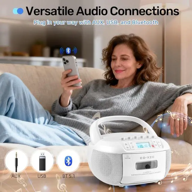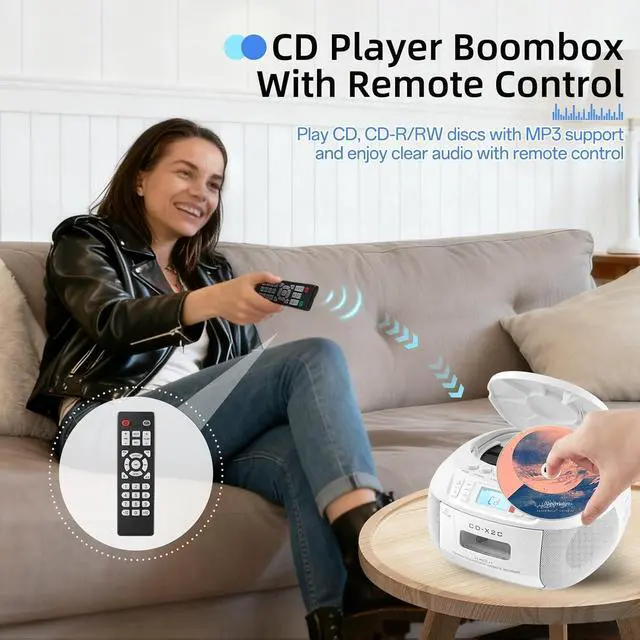 Versatile CD & Cassette Playback: This portable boombox offers multiple ways to enjoy your audio content. Play your classic CDs or MP3 files on CD-R/CD-RW discs, listen to cassette tapes, or stream wirelessly via Bluetooth. It also features USB and AUX input support, along with AM/FM radio. With a built-in headphone jack and included remote control, you can enjoy music, audiobooks, and radio programs with flexibility and conveniencewherever you go