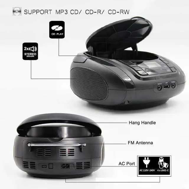 Play Music Wirelessly from Bluetooth Devices, you also can use the boombox outdoor with 4*UM2-C 1.5V batteries insert. (Battery No Included)
