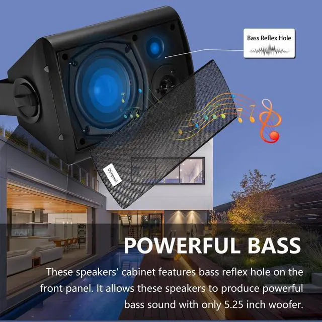 POWERFUL BASS - These outdoor speakers' cabinet features bass reflex hole on the front panel. It allows these outdoor speakers to produce powerful bass sound with only 5.25 inch woofer.