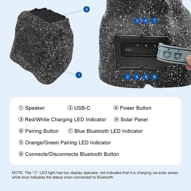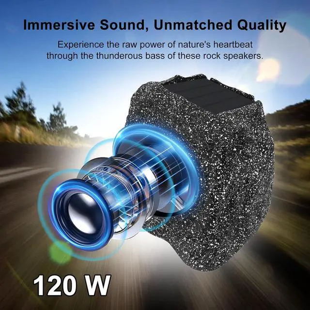 IPX7 Waterproof: Outdoor Rock Solar Bluetooth Wireless Speaker features an IPX7 waterproof design. Its construction can withstand rain, temperature changes, and other harsh weather conditions without affecting its power. It's specifically designed for outdoor activities.