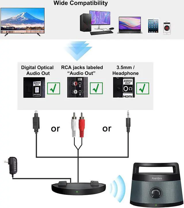 Supports multiple connections, optical, RCA or AUX with independent volume control, easy to use, simply connect the transmitter dock to your TV via the digital or analog audio output and bring the speaker next to you to listen. Digital optical connection requires a separate PCM setting on TV. Besides, people who use medical devices such as pacemaker, it is recommended to check with your doctor before purchasing.
