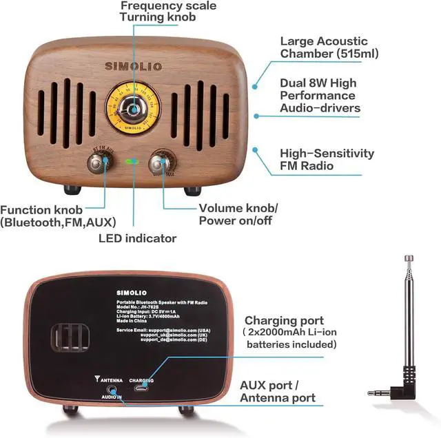 Long Playtime -- Built-in rechargeable 2x2000mA Li-ion batteries support up to 12 hours of wireless / AUX playtime or 20 hours of FM listening time (varies by volume level and content), and the convenience of being able to charge from most USB power sources adds onto its advantages.
