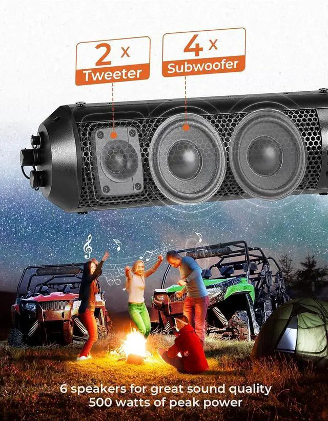 ALUMINUM ALLOY SPEAKER COLUMN: Golf cart speakers Bluetooth-Compatitble systems feature strong impact resistance; the high rigidity and density of the aluminum material effectively suppress resonance, resulting in purer sound. Excellent thermal conductivity keeps components running at low temperatures, preventing overheating and distortion