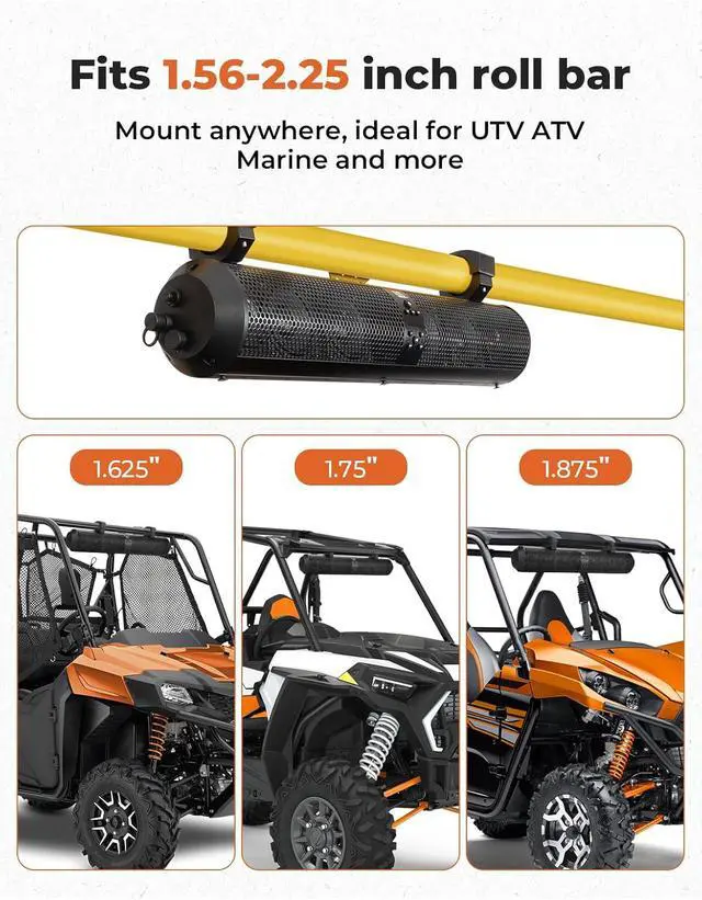 COMPATIBILITY: The multi-angle adjustable clamp fits roll cages with a diameter of 1.56-2.25 inches. KEMIMOTO side-by-side speakers are suitable for 12-volt vehicles. Perfect for UTVs, ATVs, and Golf carts. Compatible with models such as Polaris RZR, CFMOTO Zforce, Can-Am Maverick X3, Maverick R, and Defender