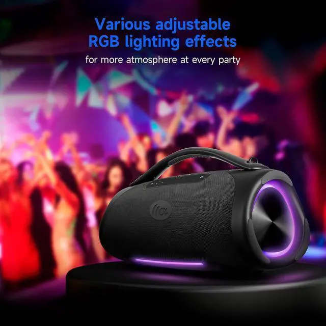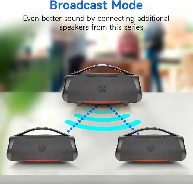 TWS Stereo Pairing & 99+ Speaker Sync Connect multiple boomboxes for surround sound or large-scale broadcast setups.