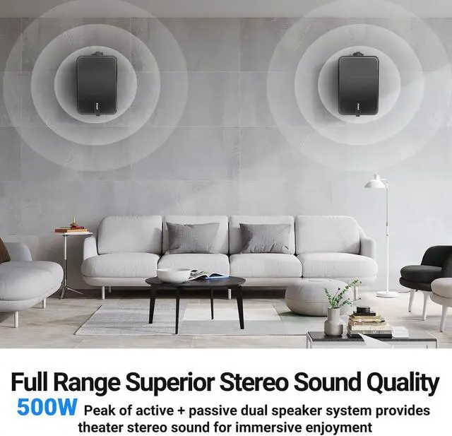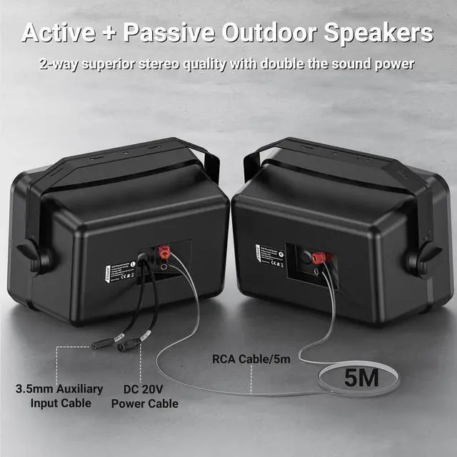 : The active speaker of the outdoor speaker system is powered by a corded adapter, providing stable and strog power output. Each speaker has built-in high-quality 1.5-inch tweeter and 6.5-inch woofer for surround stereo sound reproduction and impressive bass response. (Corded power adapter is included.)