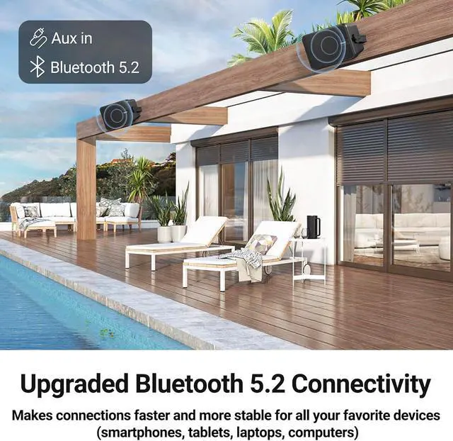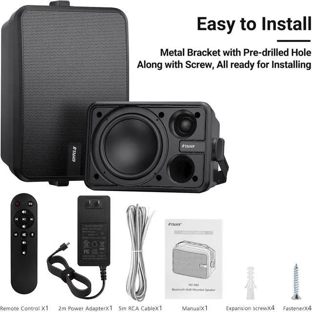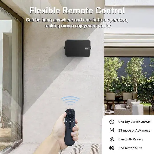 : With 11.6inch in length and 7.4inch in height, this wireless speaker system comes with a remote control for easy operation and is suitable for many spaces, such as under the porch roof, under the patio cover, in outdoor bars, gazebos, garages, or small shops, etc. Arrived with all mounting accessories, very easy to install.